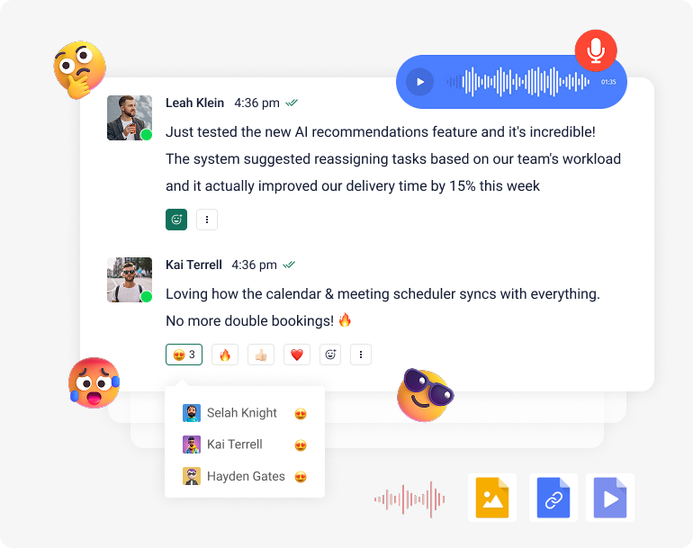Built-in team chat with file sharing, voice notes, emojis, and task-linked conversations.