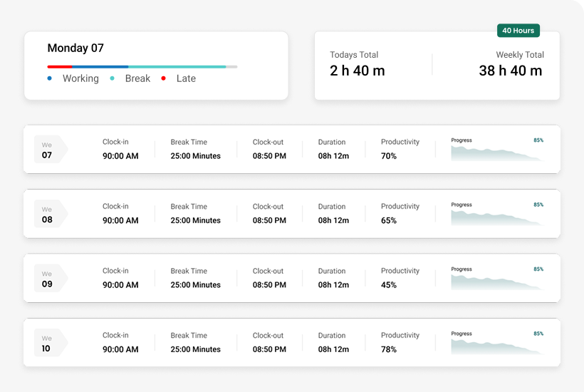 Track work hours, breaks, productivity, and attendance with precision. Automated records ensure transparency, payroll accuracy, and trust across teams.